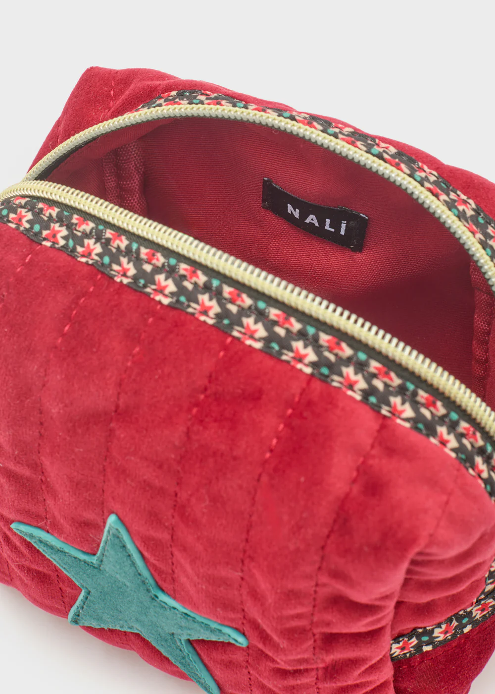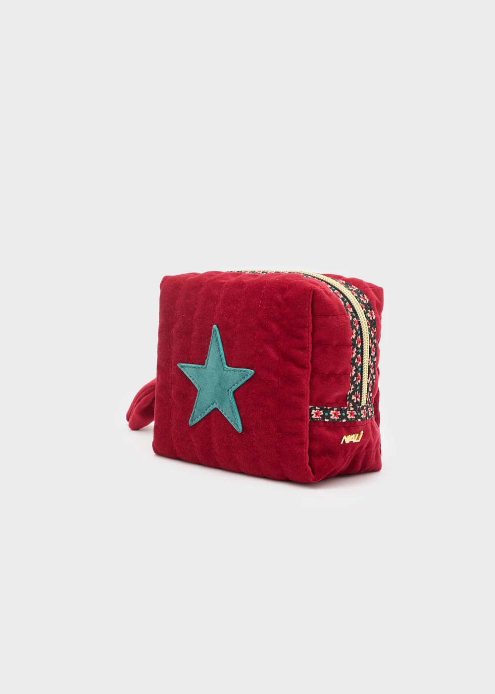 Beauty case in tessuto morbido con imbottitura trapuntata e applicazione decorativa sul davanti. Un accessorio funzionale e alla moda, ideale per custodire trucchi e oggetti personali con stile.