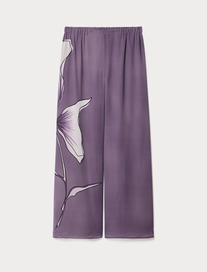 Stampa esclusiva a fiore piazzato per i pantaloni in georgette, dalla linea ampia. Per dare un twist grafico alle tue mise eleganti.