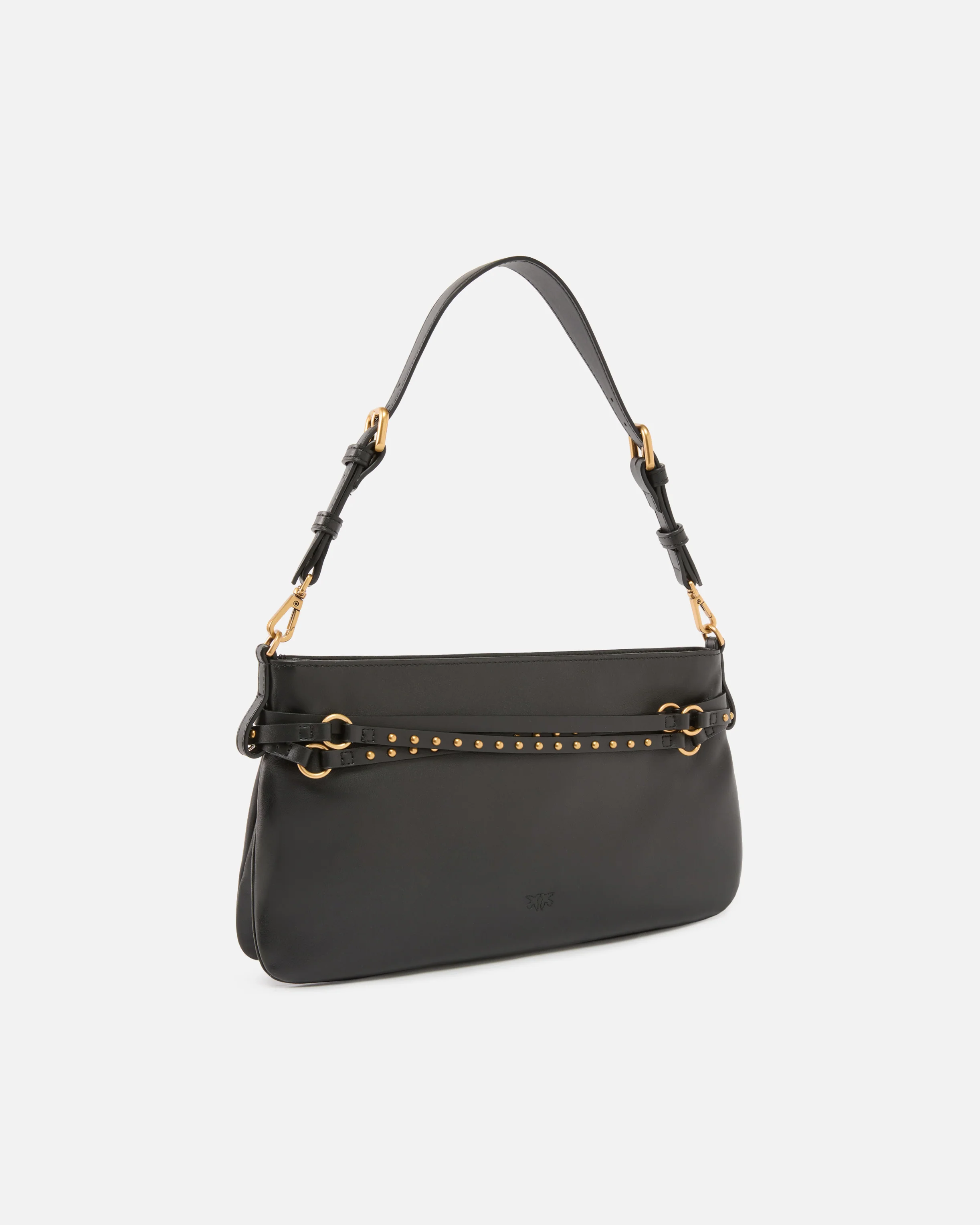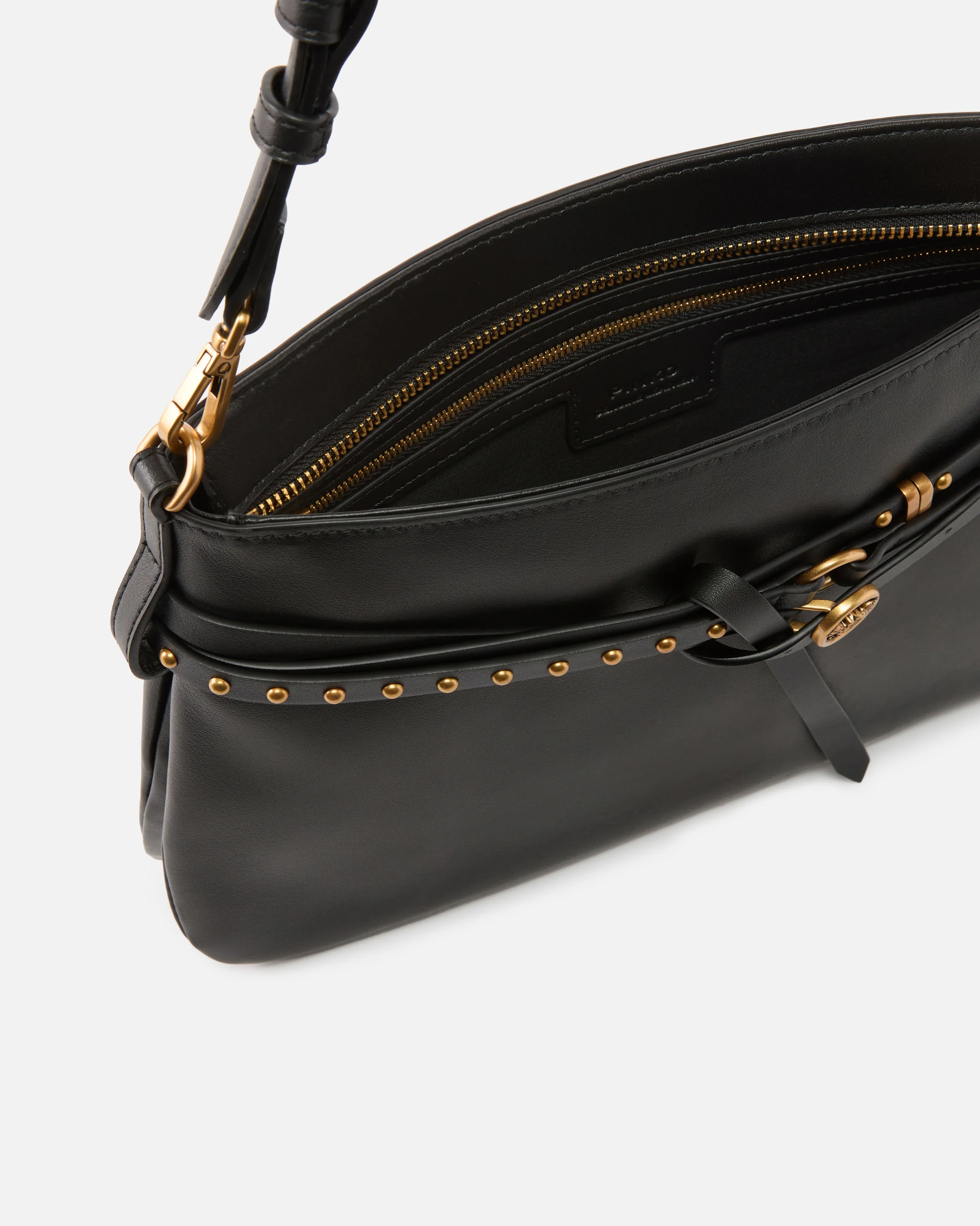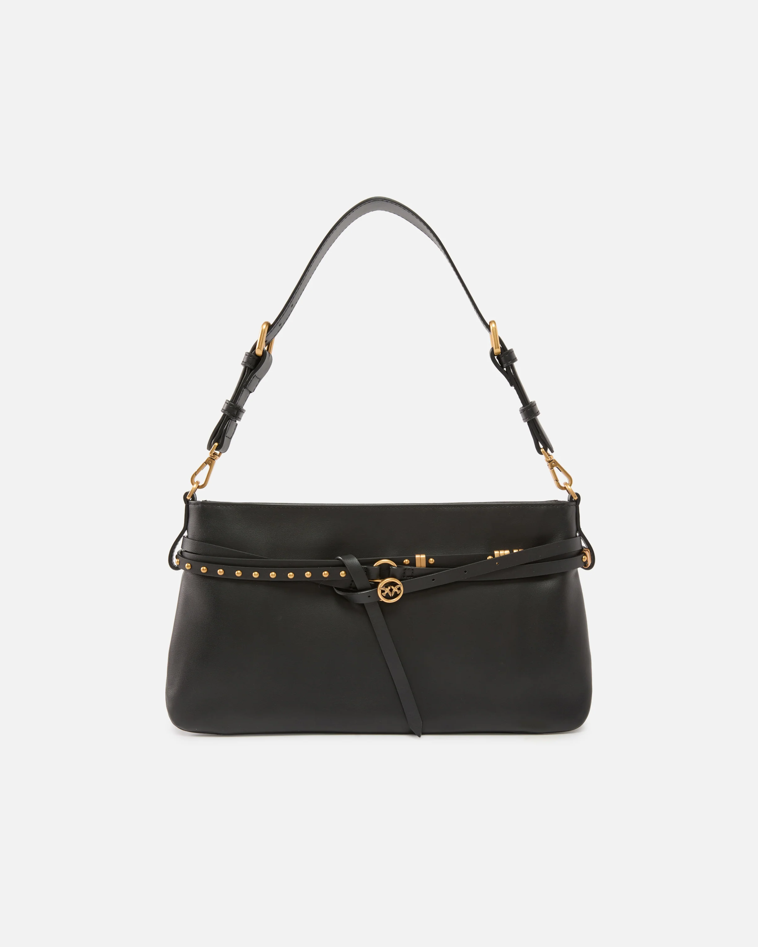 Borsa Belt Bag di medie dimensioni con design piatto e forma leggermente a trapezio, realizzata in morbida pelle. Il modello è decorato da una sottile cintura coordinata regolabile che avvolge la parte superiore con più giri, arricchita da borchie arrotondate, una piccola fibbia circolare con gli iconici uccellini Love Birds e anelli decorativi in metallo che formano il logo lettering PINKO. Le due tracolle in pelle rimovibili, una più corta e una più lunga, offrono un comodo indosso a spalla oppure crossbody, mentre la chiusura con zip rivela un interno foderato in drill di cotone dotato di una comoda tasca a parete con targhetta logata. Attiva la tua borsa PINKO: verifica l'autenticità del tuo prodotto e accedi all'esperienza personalizzata avvicinando il tuo smartphone al ricamo Love Birds che trovi sul retro della borsa!