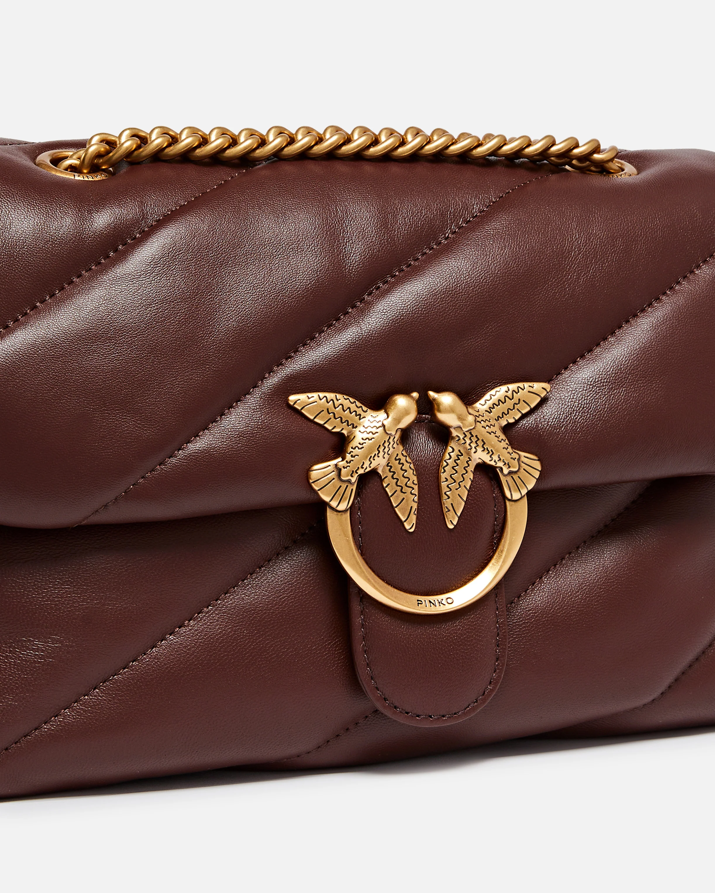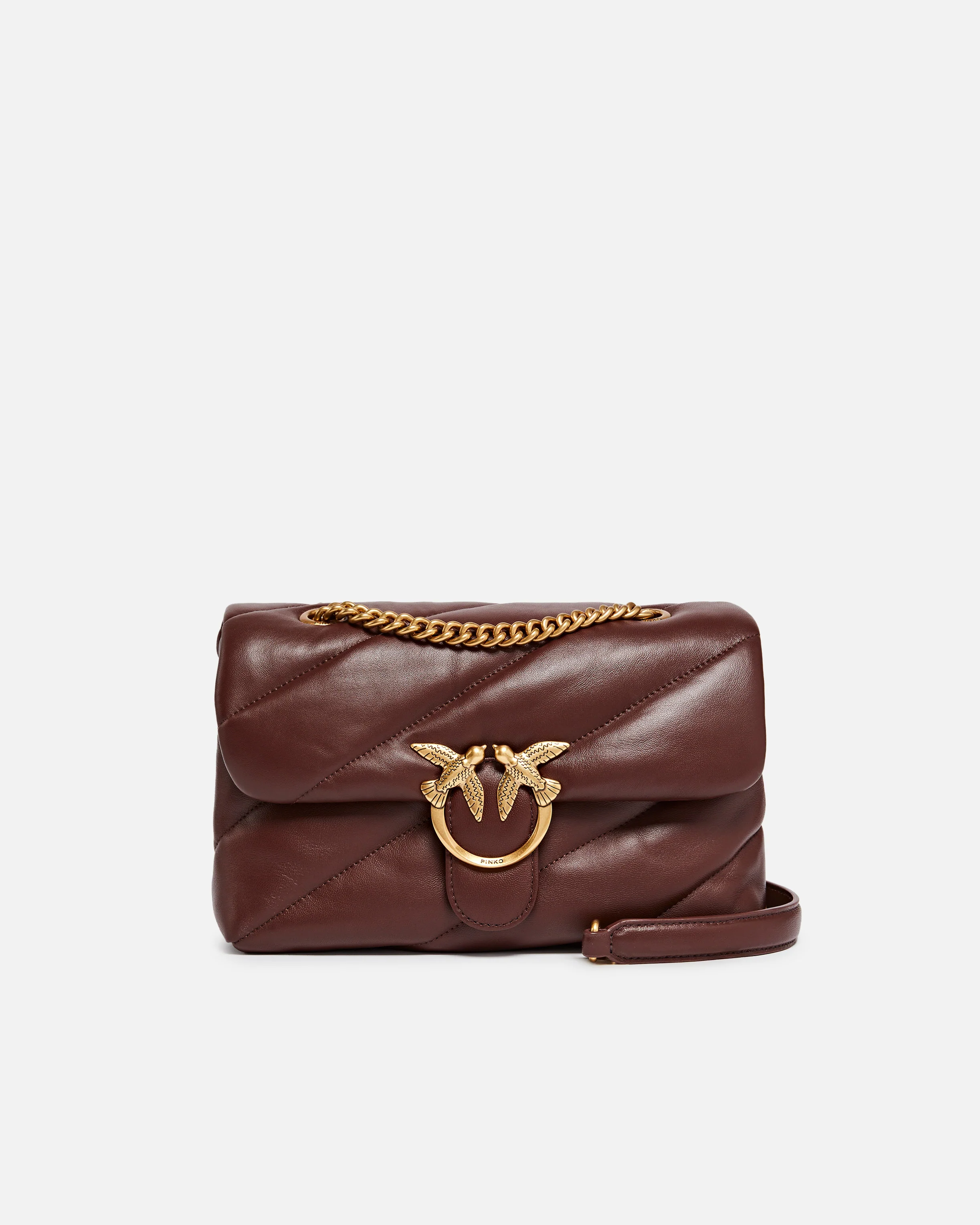 Classic Love Bag Puff in morbida nappa con maxi trapuntatura obliqua. La chiusura è completata dall'iconica fibbia in metallo Love Birds Diamond Cut. L'interno è foderato in microfibra scamosciata e comprende tramezza chiusa con zip e tasca a parete. La tracolla combina la classica catena metallica rotonda al pratico spallaccio in nappa