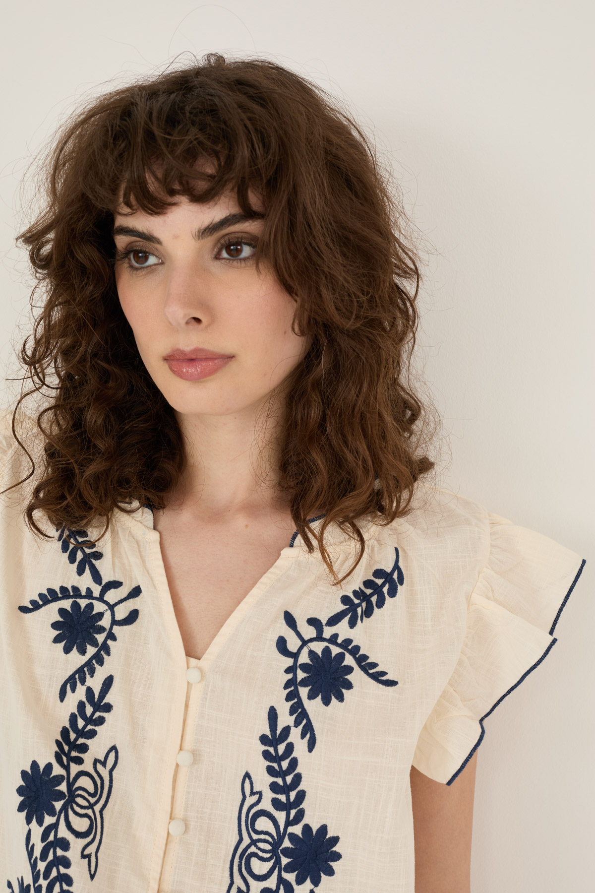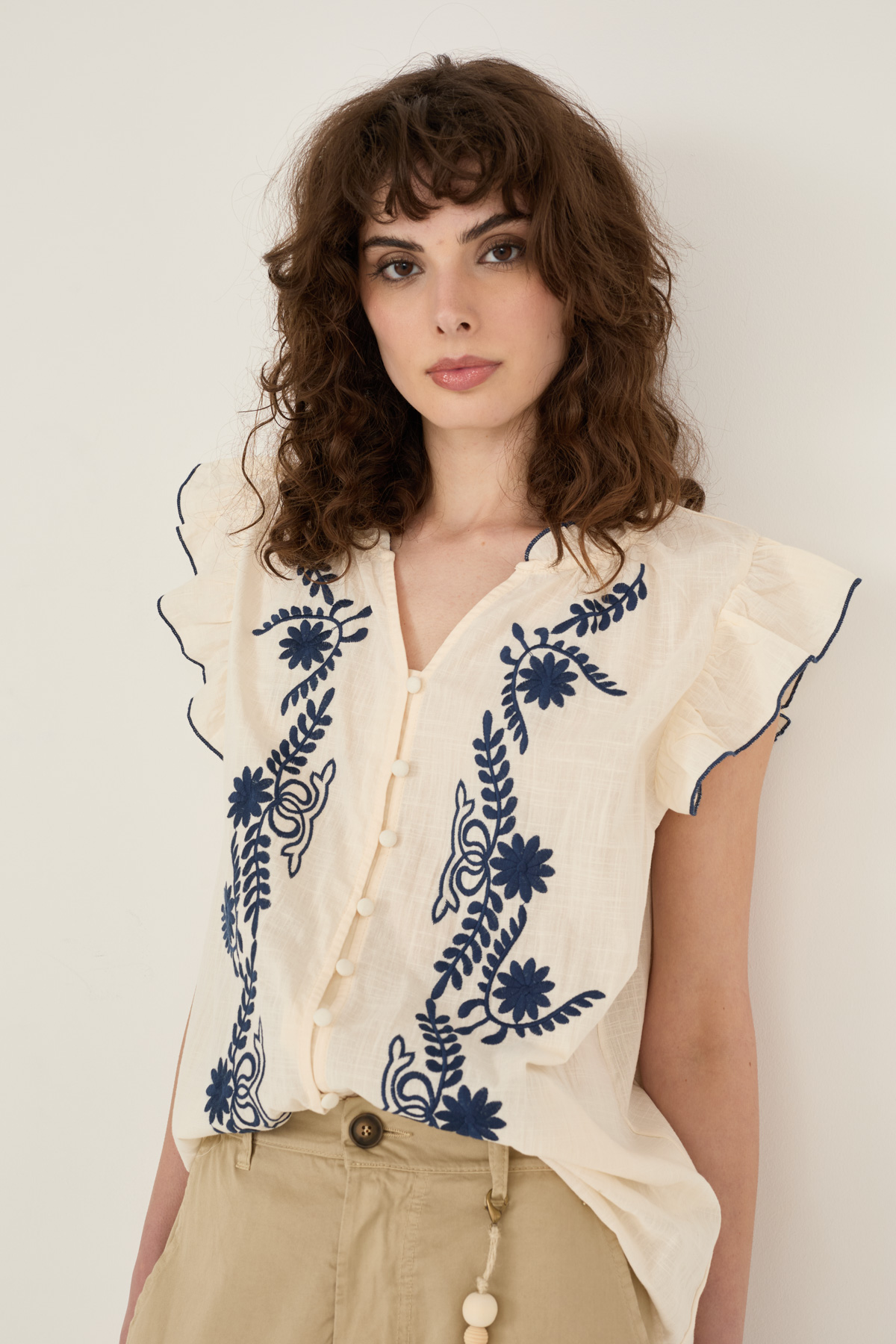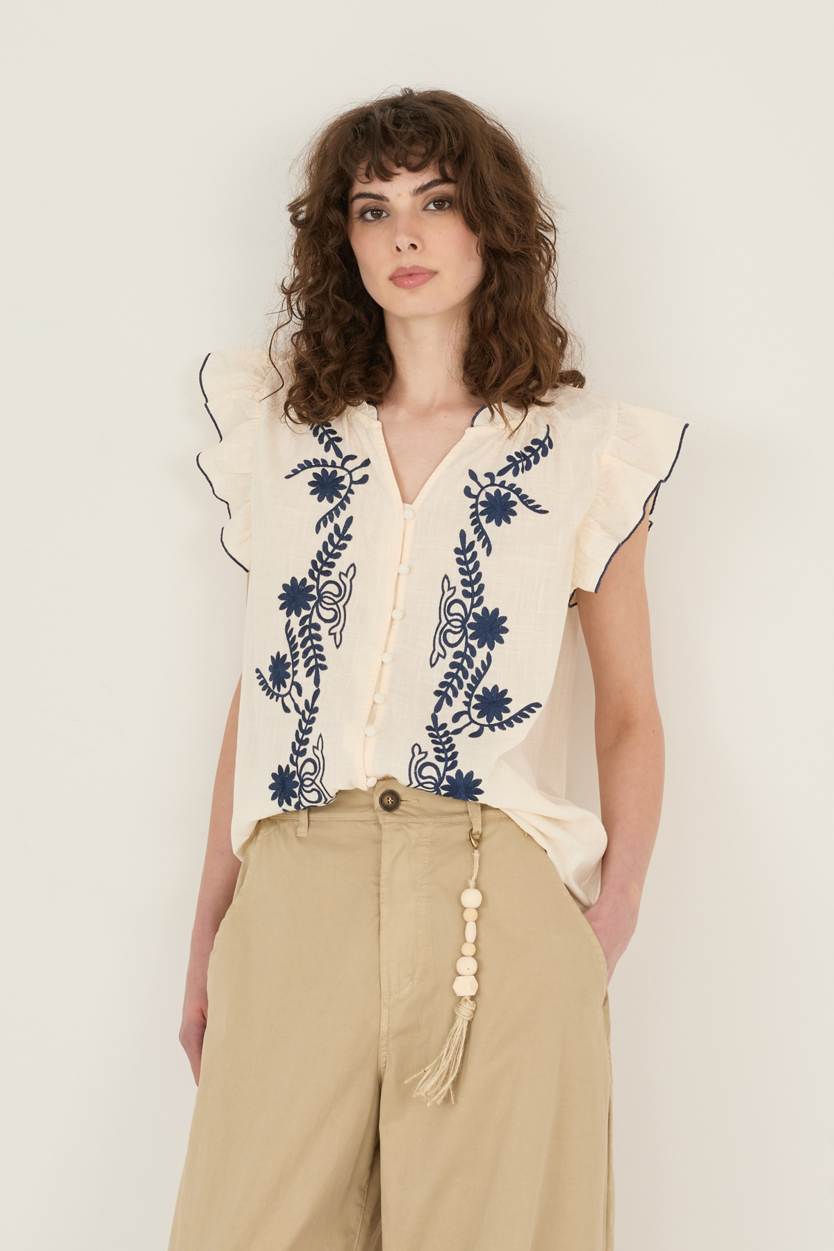 Camicia in cotone con ricami. Modello con maniche volants, scollo a V, chiusura con bottoncini foderati in tinta.