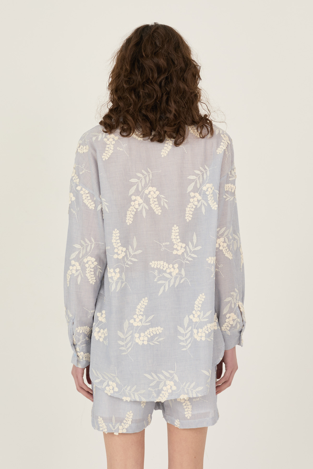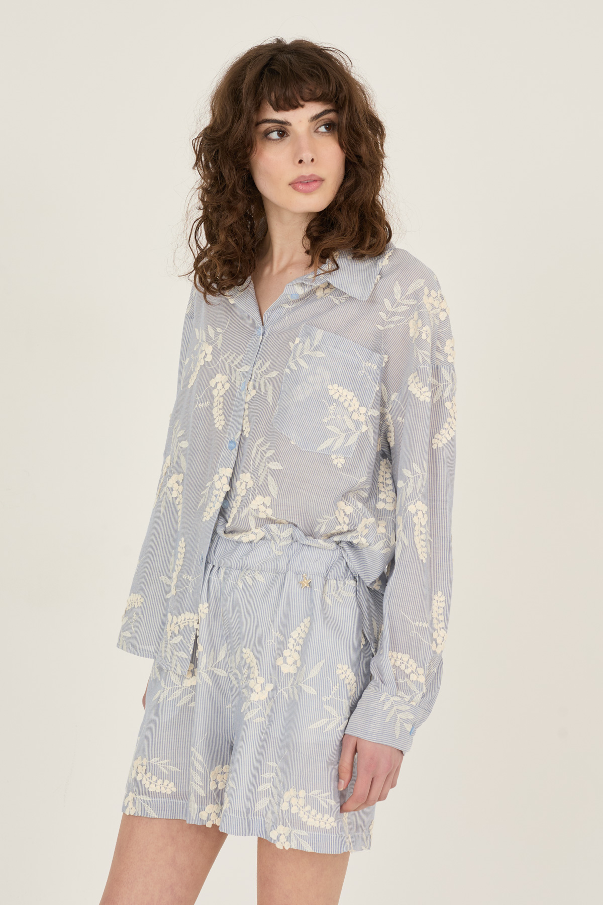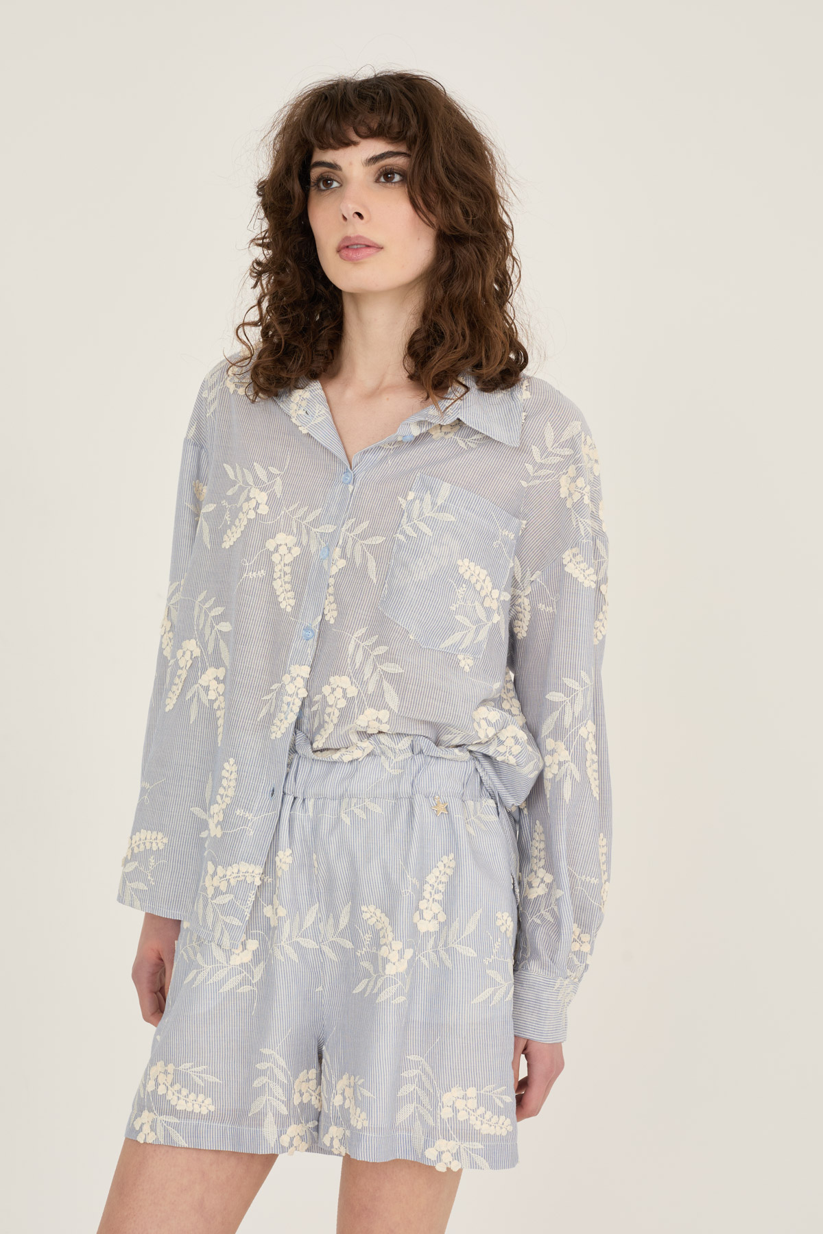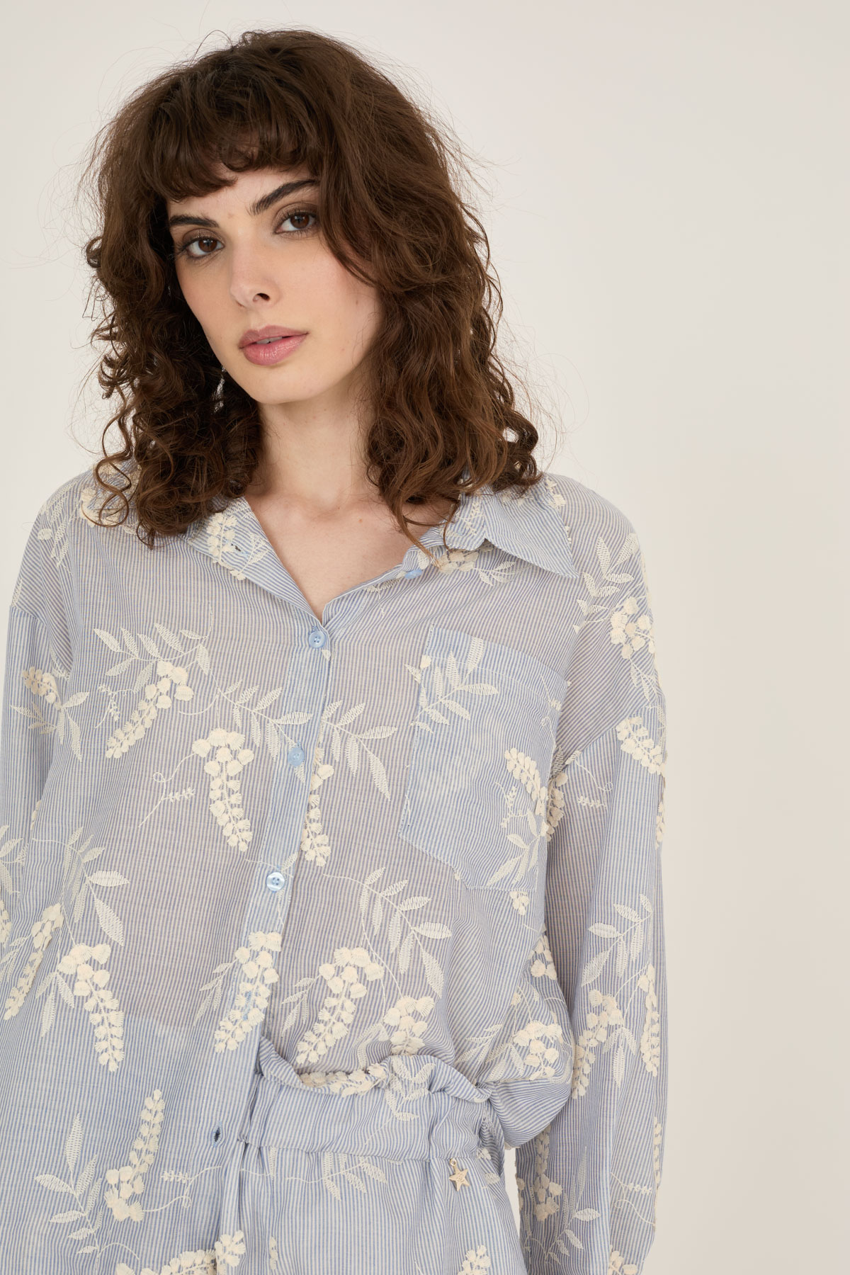 Camicia millerighe con ricami. Modello in cotone, con taschina, collo classico, maniche lunghe.