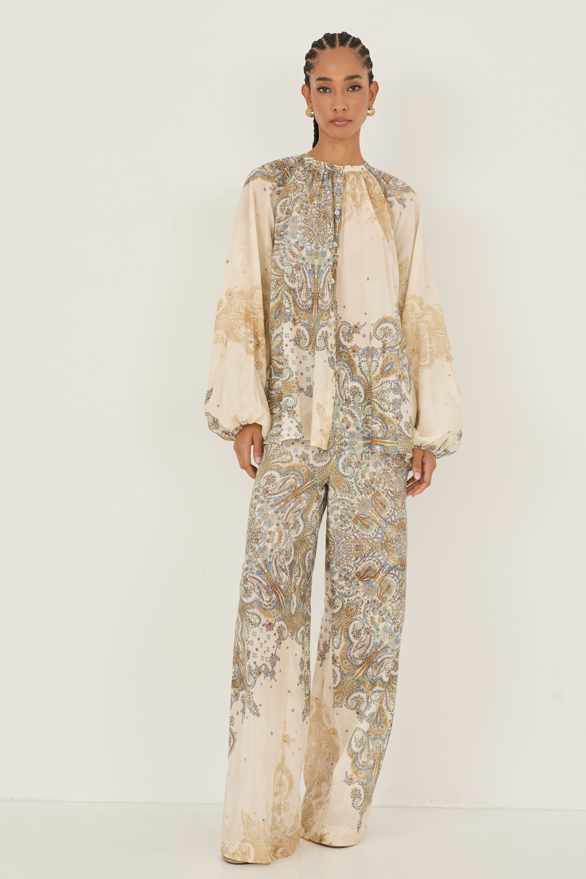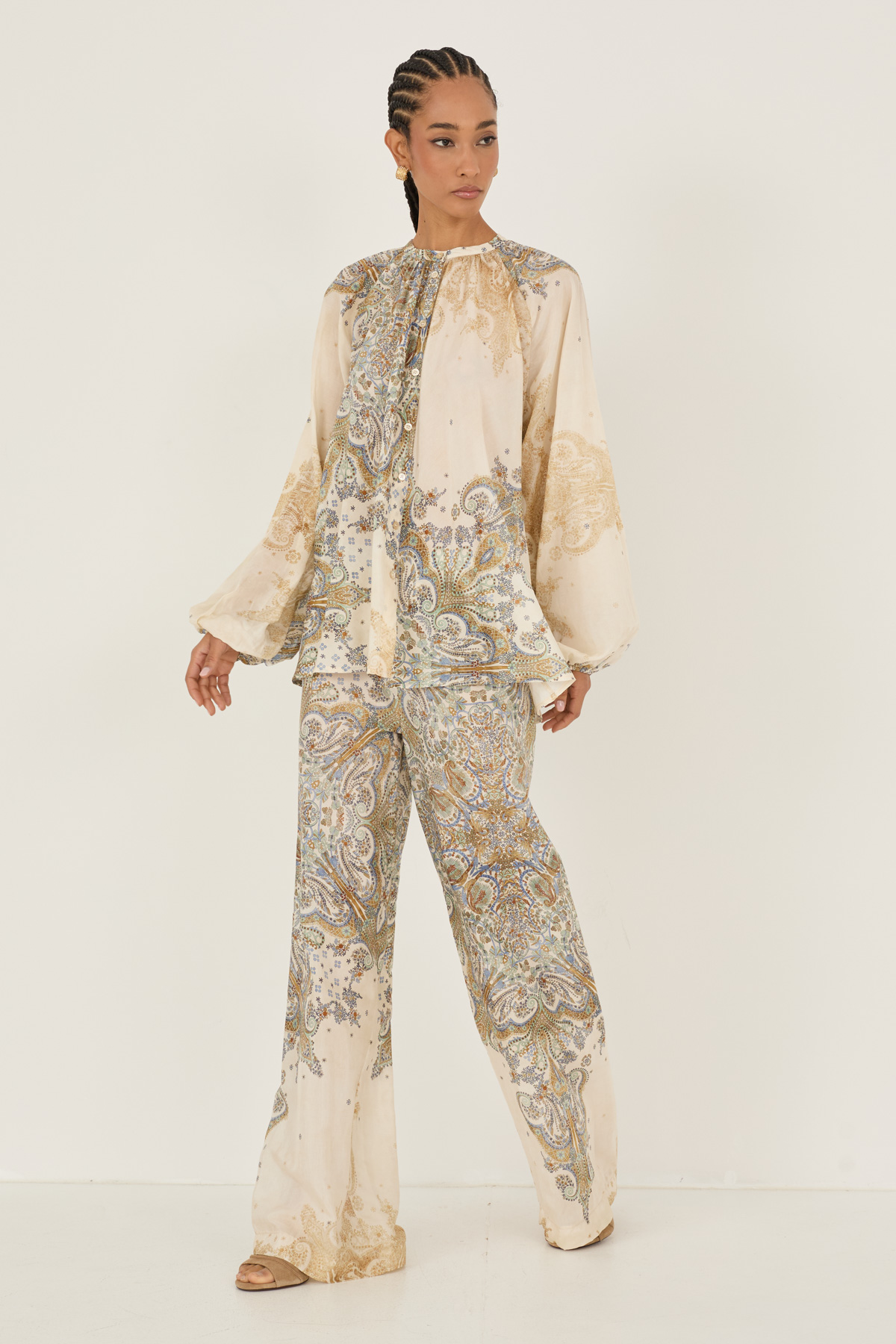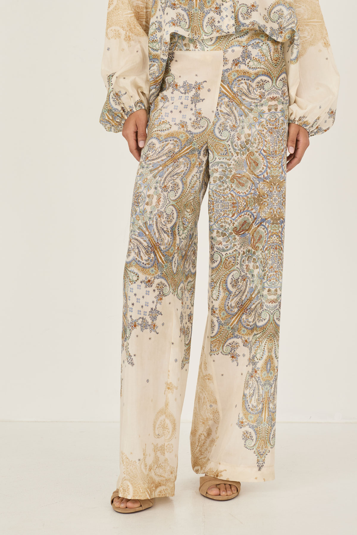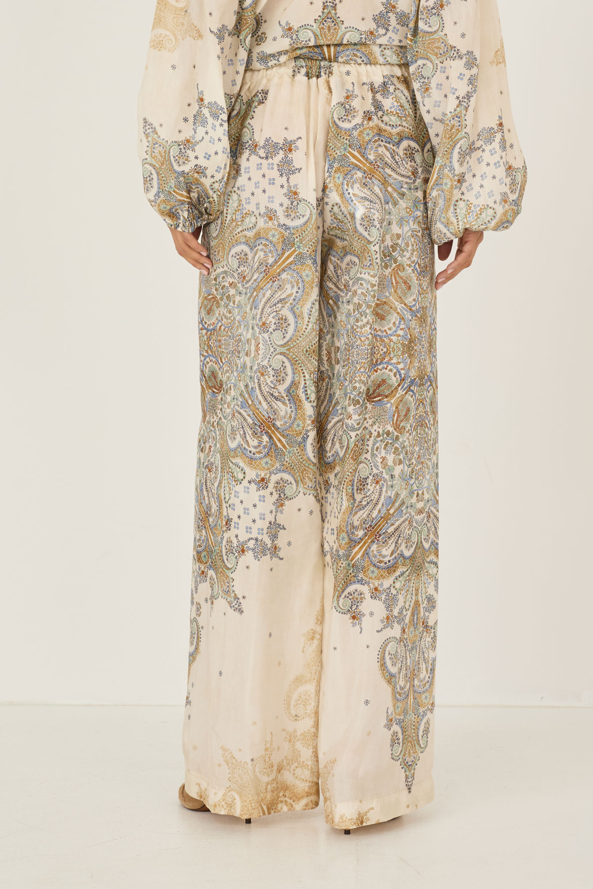 Pantalone a fantasia in rayon e cotone. Modello gamba ampia, con elastico sul retro. Ideale da abbinare alla sua camicia!