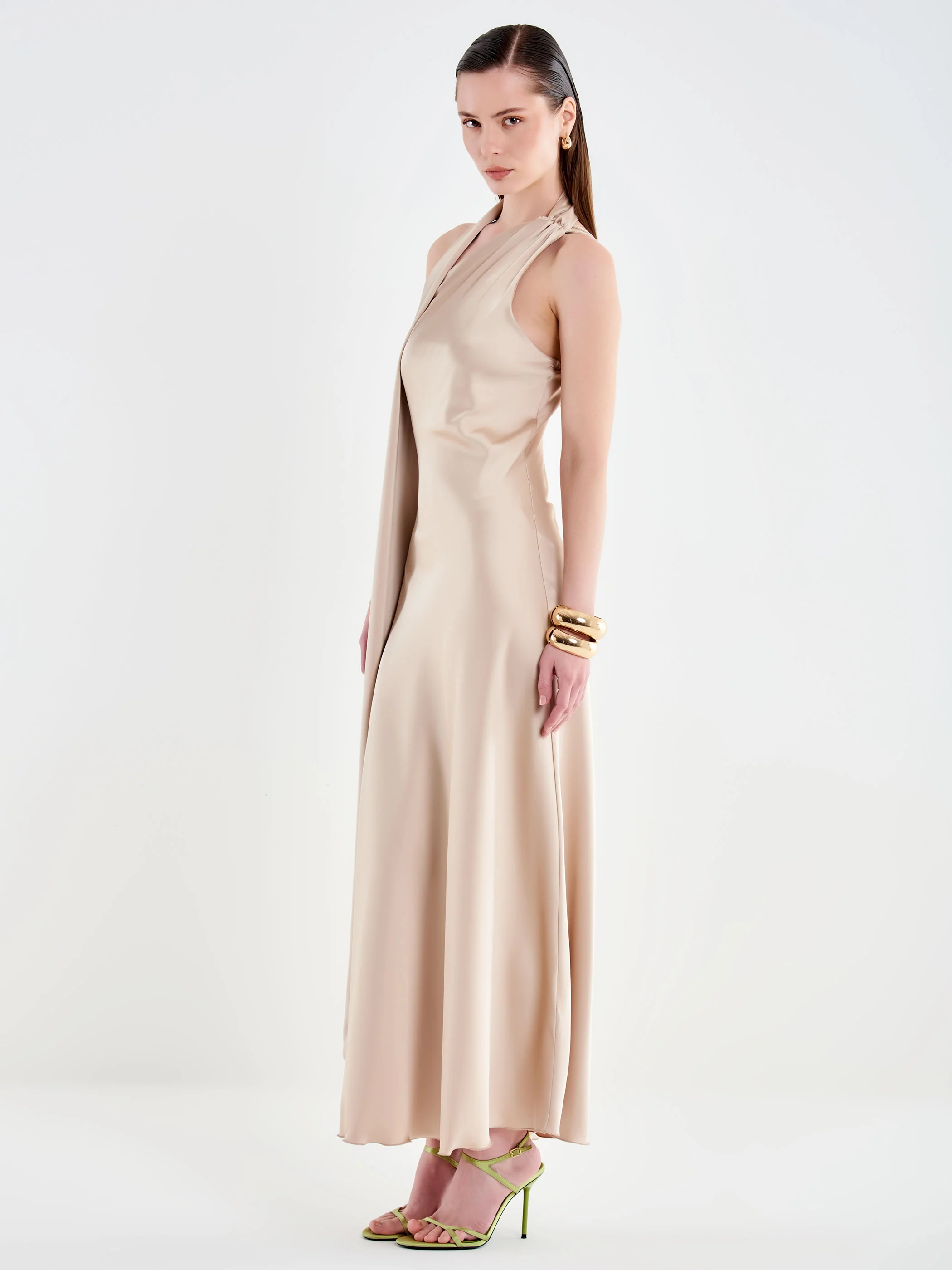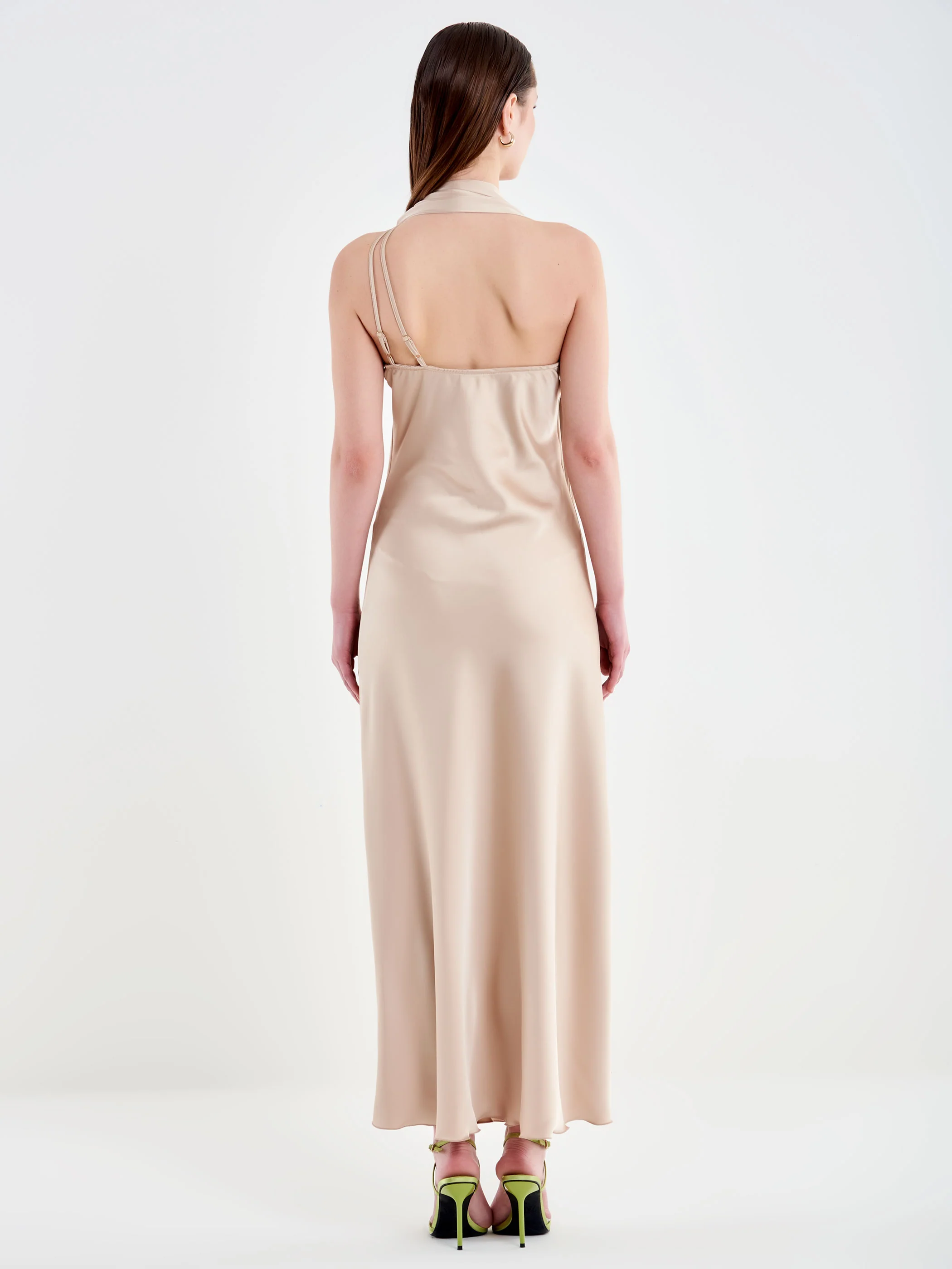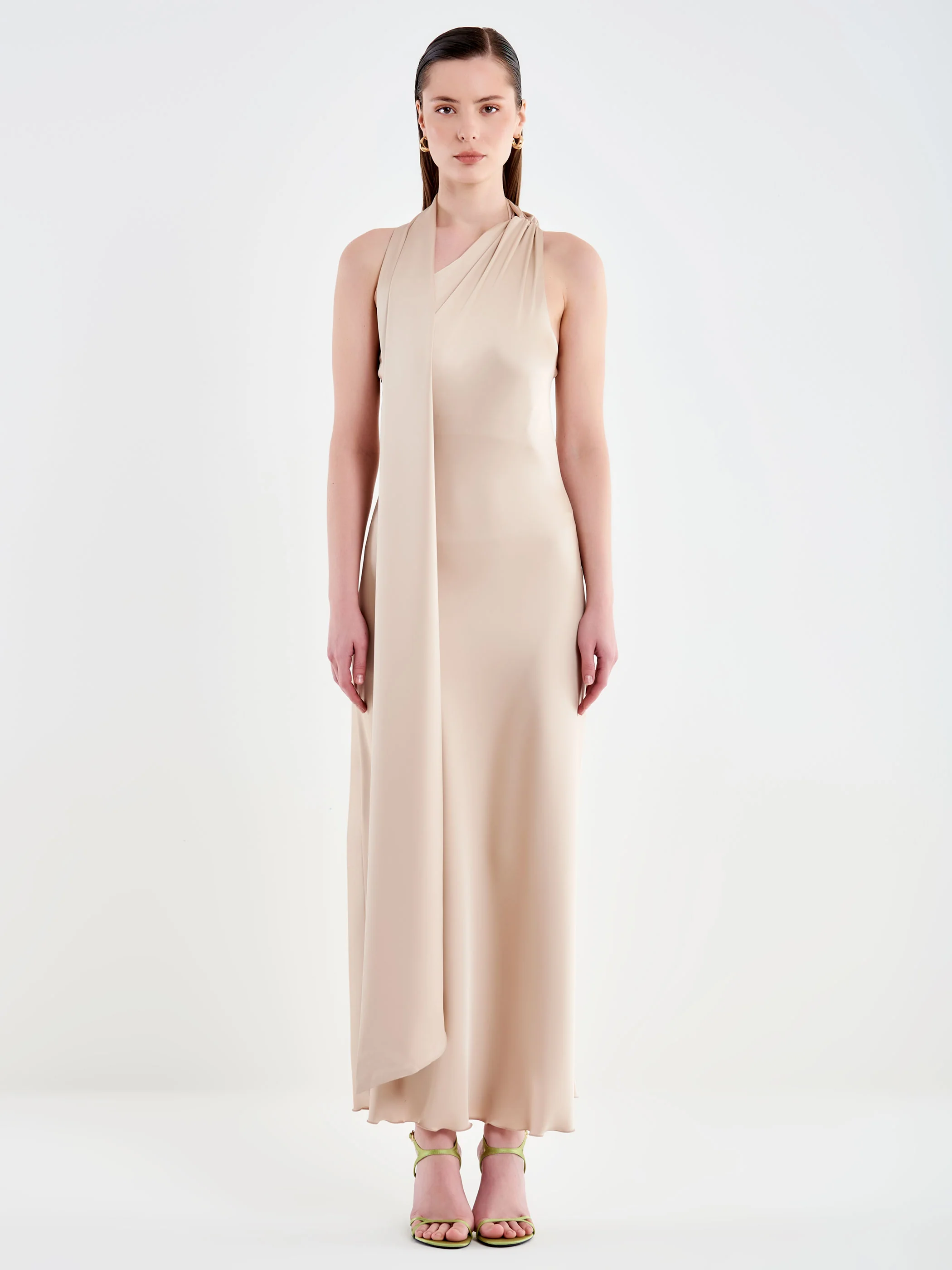 Abito lungo monospalla con fusciacca lunga. Dettaglio spalline regolabili sul retro.