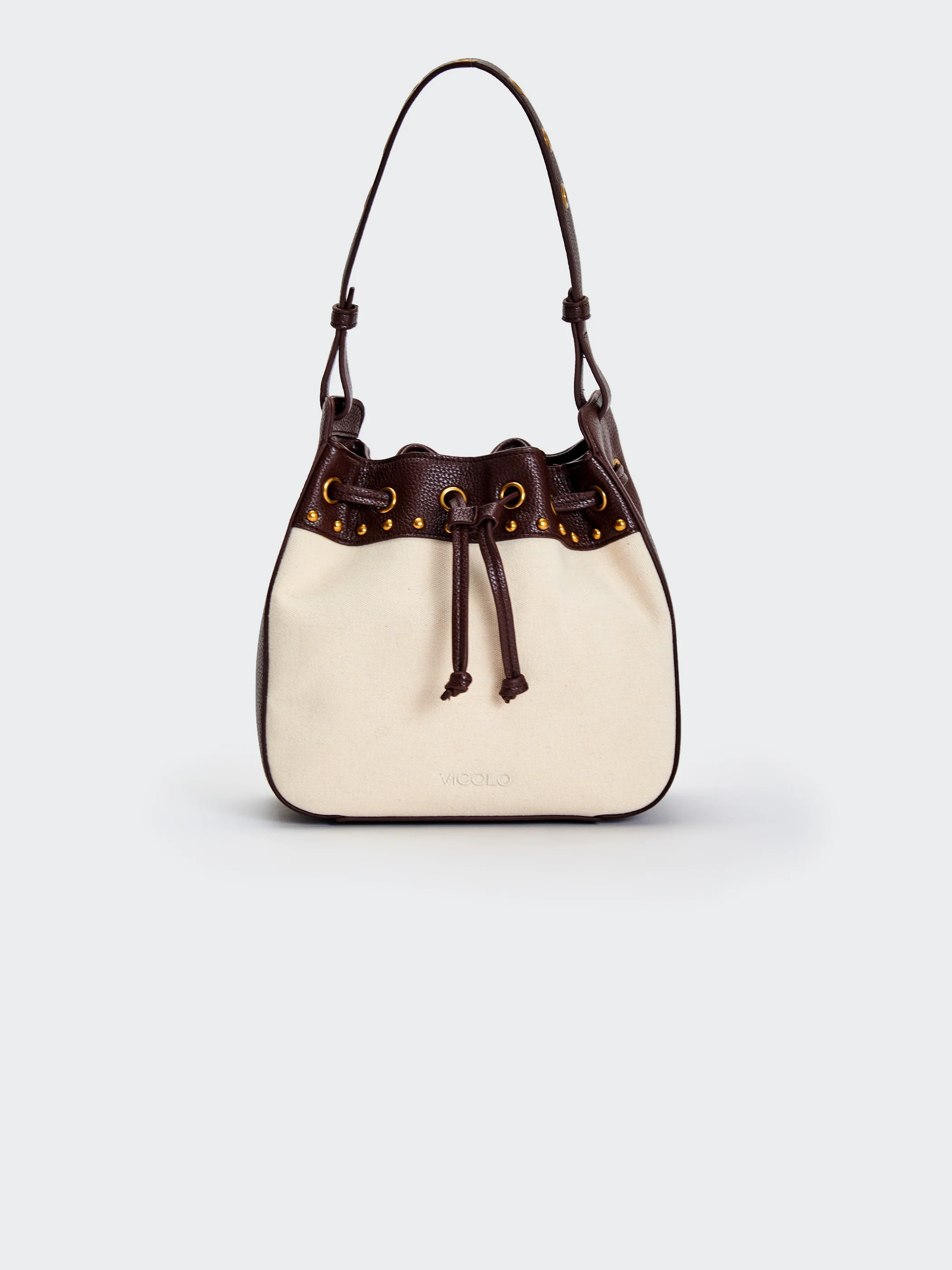 Borsa Canter Bucket a spalla in canvas e ecopelle martellata con borchie. Chiusura con laccio e coulisse passante su profilo in ecopelle. Scomparto divisorio con cerniera di metallo con profilo in ecopelle martellata. Dettaglio logo Vicolo ricamato su canvas ton sur ton. Finiture in metallo color oro. Tasca interna con cerniera e taschina piatta.