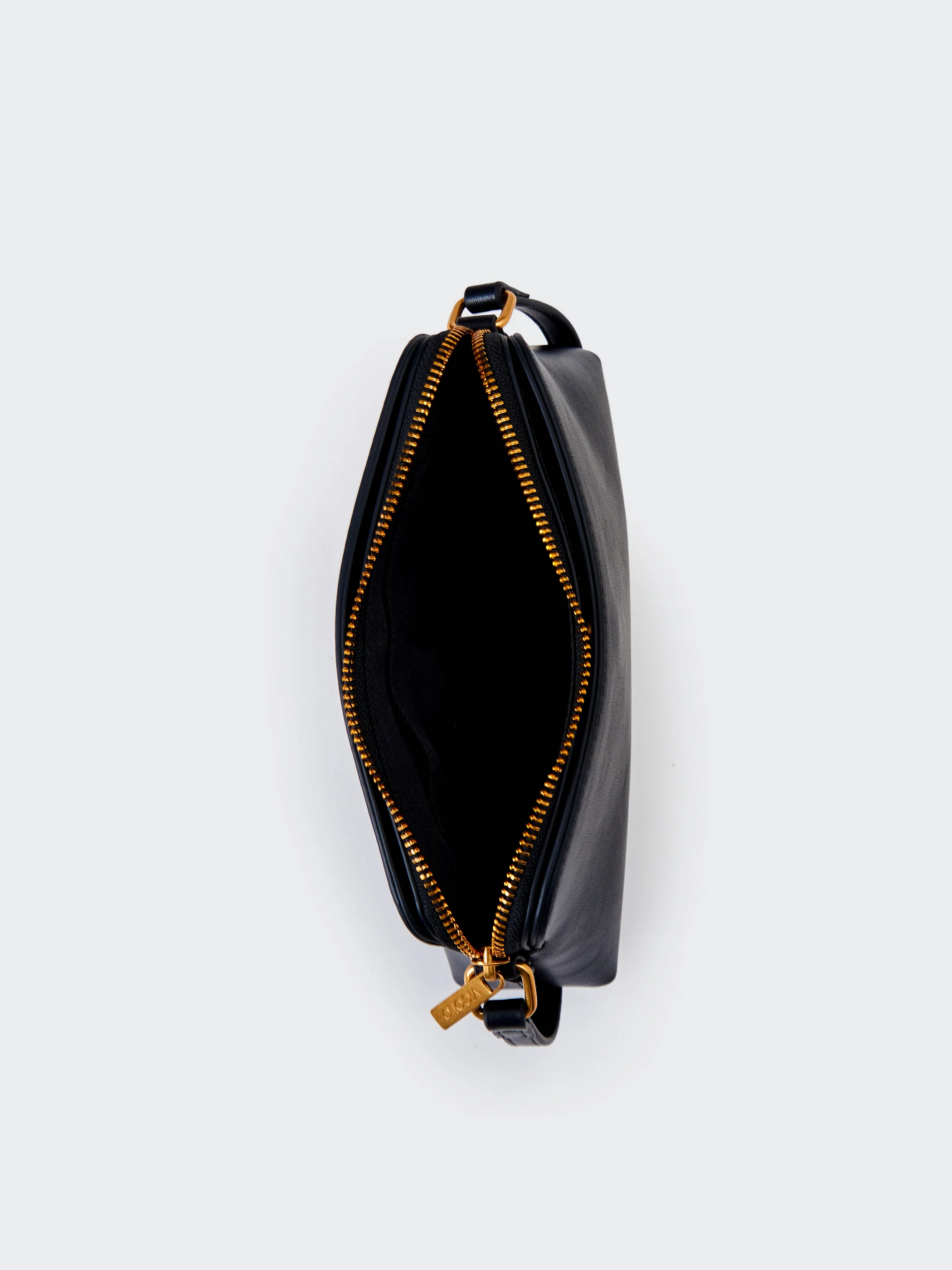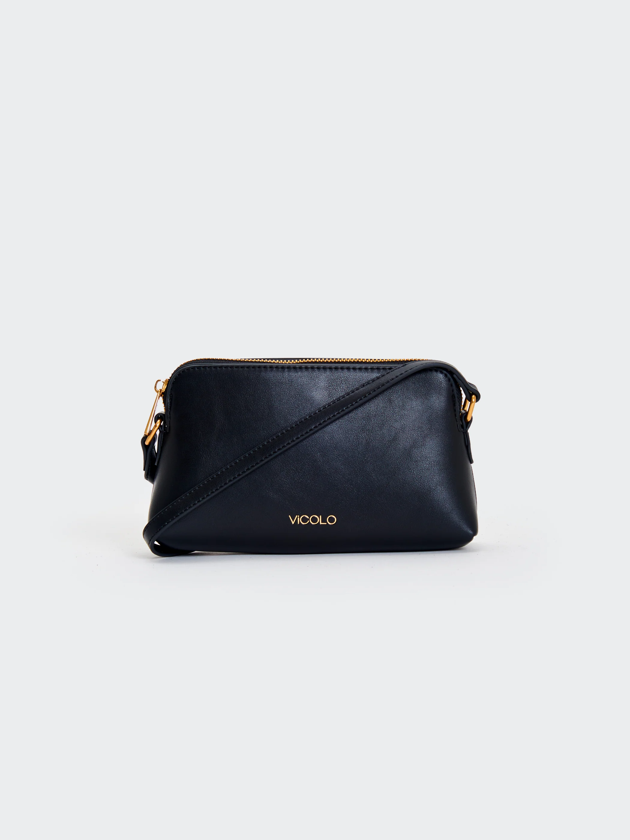 Borsa Essential a tracolla in ecopelle. Chiusura con cerniera. Dettaglio logo Vicolo impresso. Dettaglio finiture lucide color oro. Tasca interna con cerniera e taschina piatta.