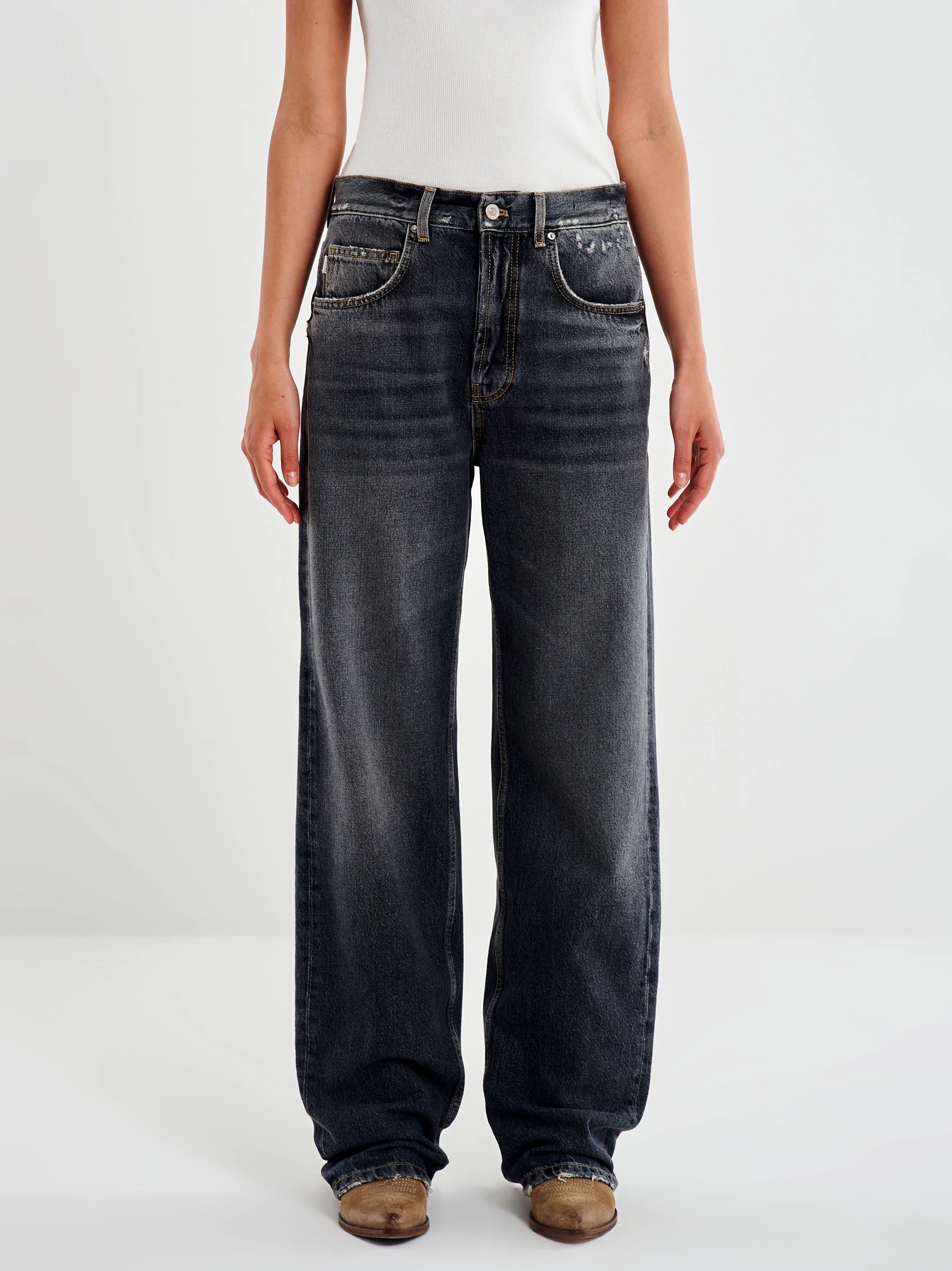 Jeans Adriana relaxed fit vita media. Modello cinque tasche. gamba ampia e extra lunga. Chiusura frontale con zip e bottone. Denim nero con schiariture e mollature.