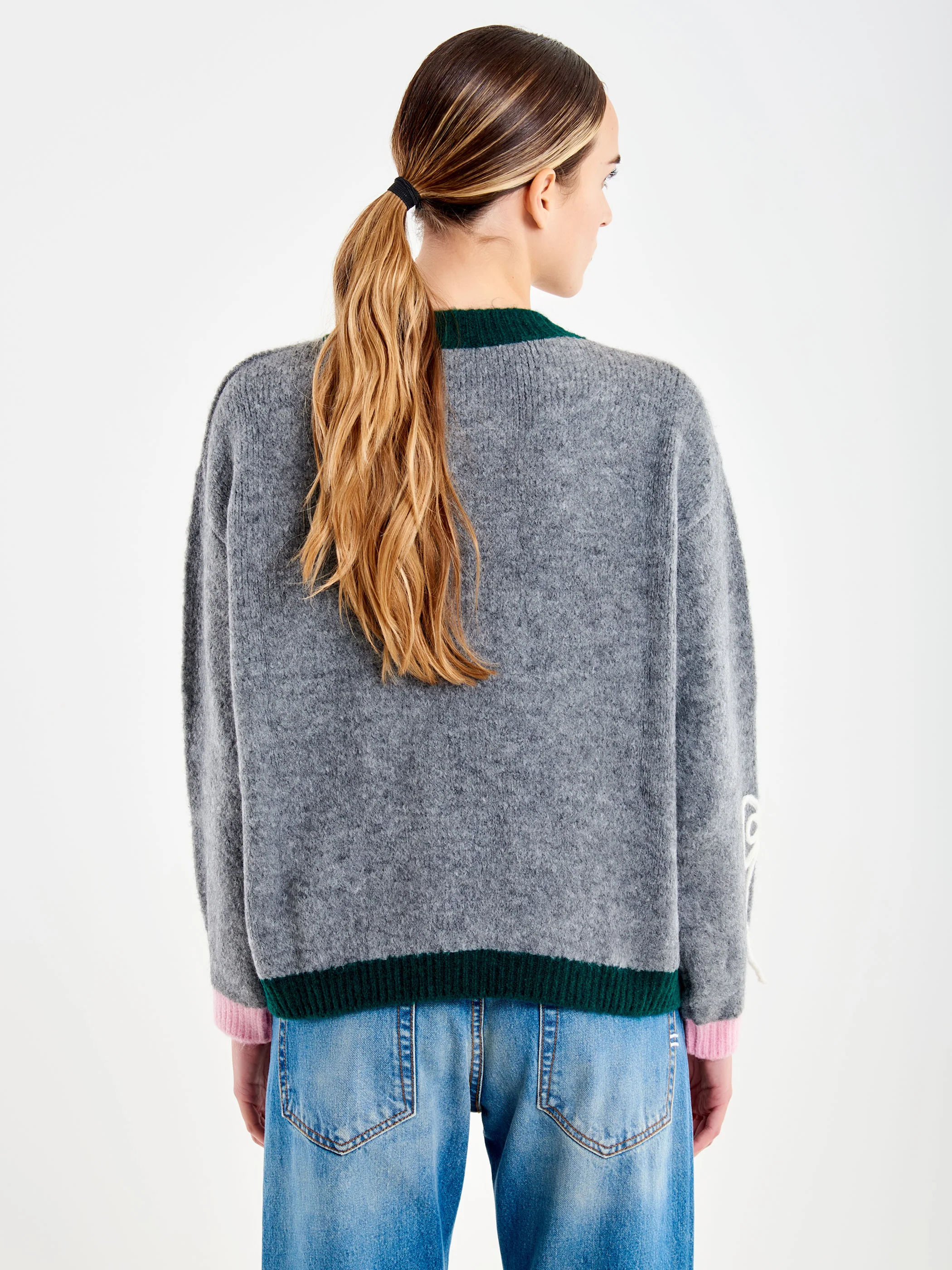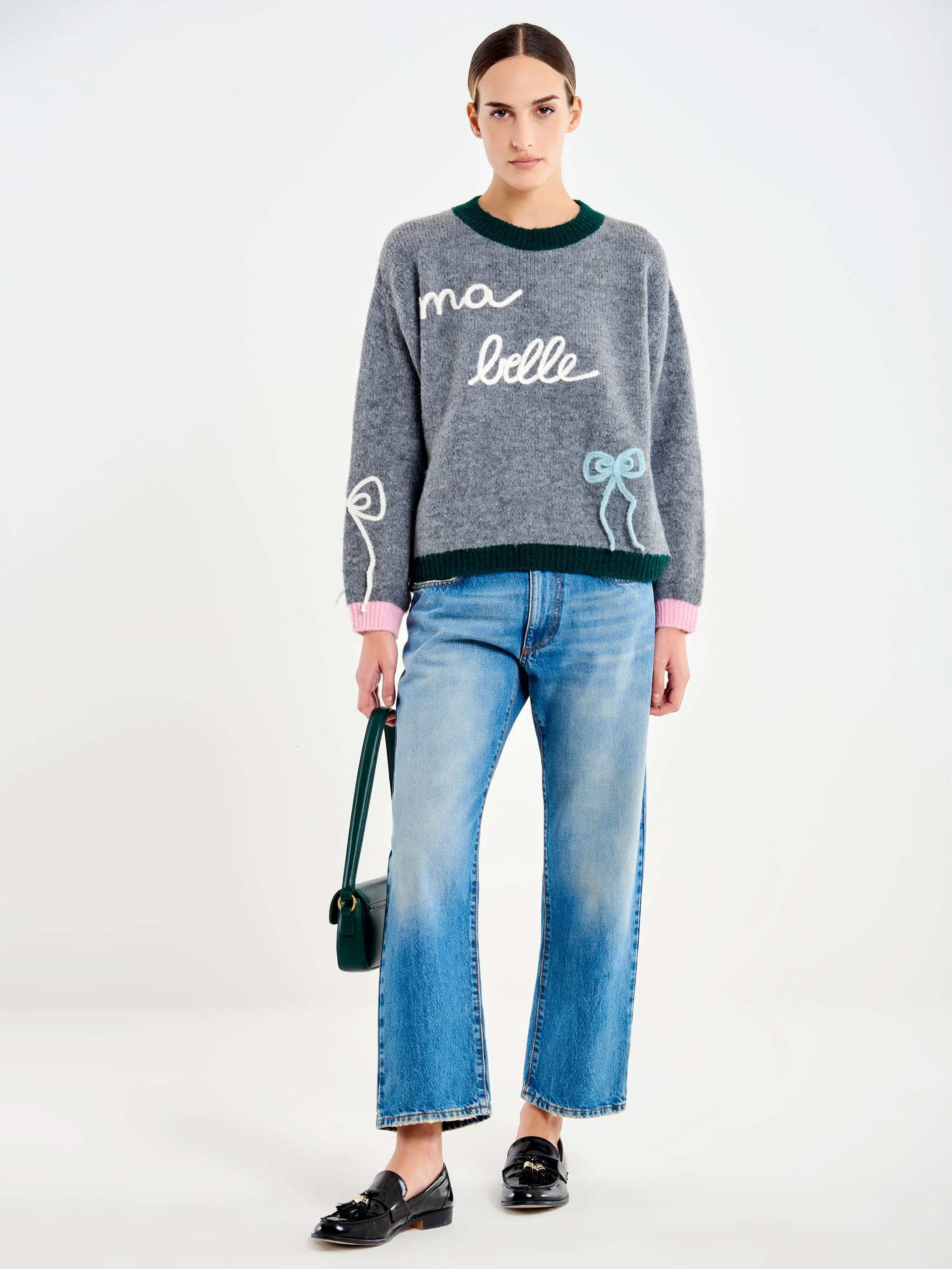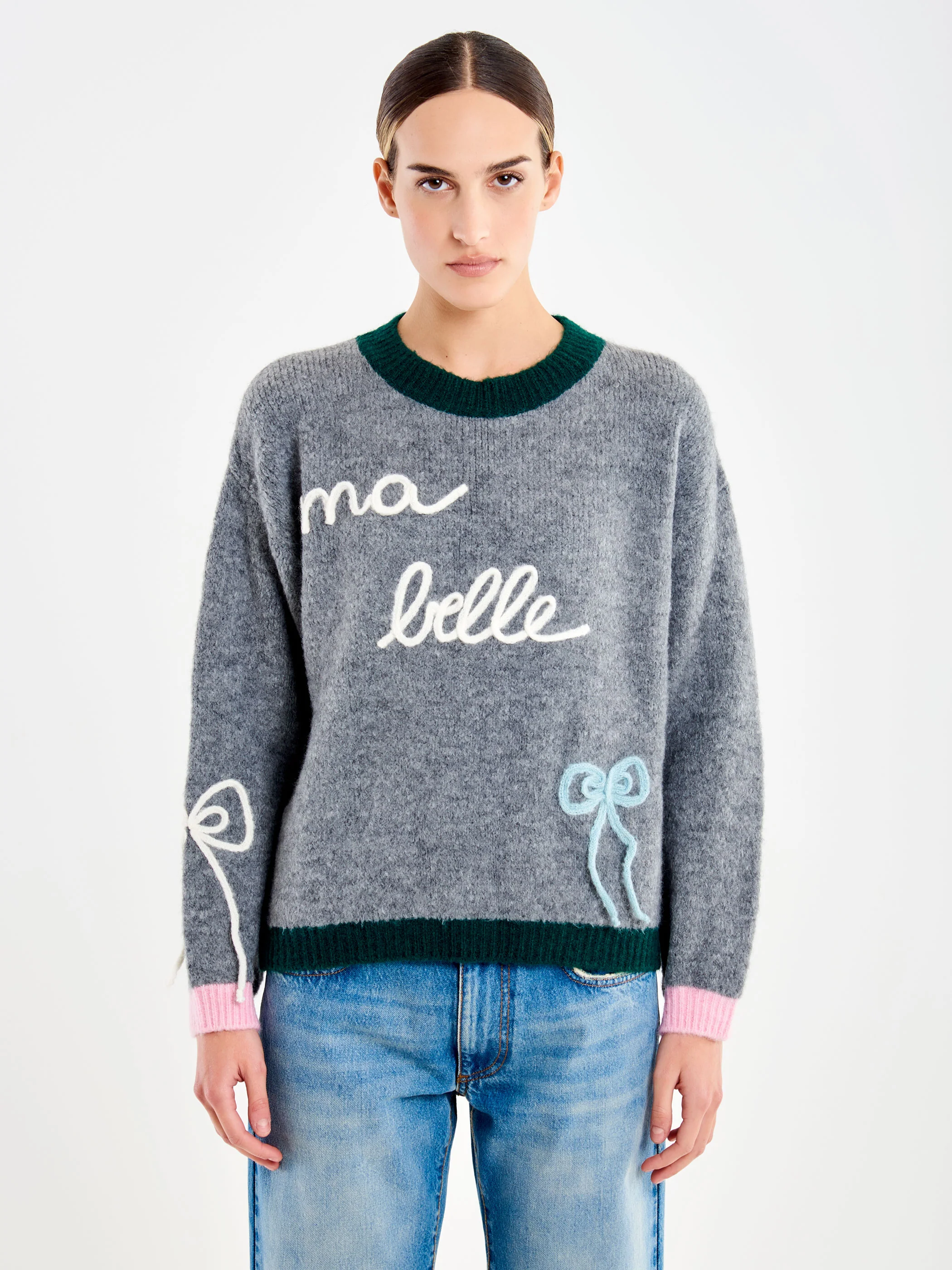 Pull girocollo maniche lunghe con ricamo fiocchetti e frase "ma belle". Finiture in maglia a coste a contrasto.